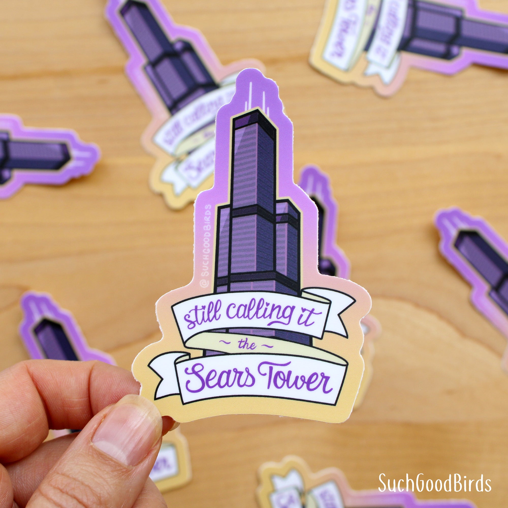 A 3.5" waterproof vinyl sticker celebrating the city of Chicago, Illinois! Featuring the former World's Tallest skyscraper, the Willis Tower, and a banner that says "Still Calling it the Sears Tower". This landmark changed its name to "Willis" in 2009, but some of us still think of it as the Sears Tower. Makes a fun cute souvenir for tourists, visitors, and residents of Chicago alike.